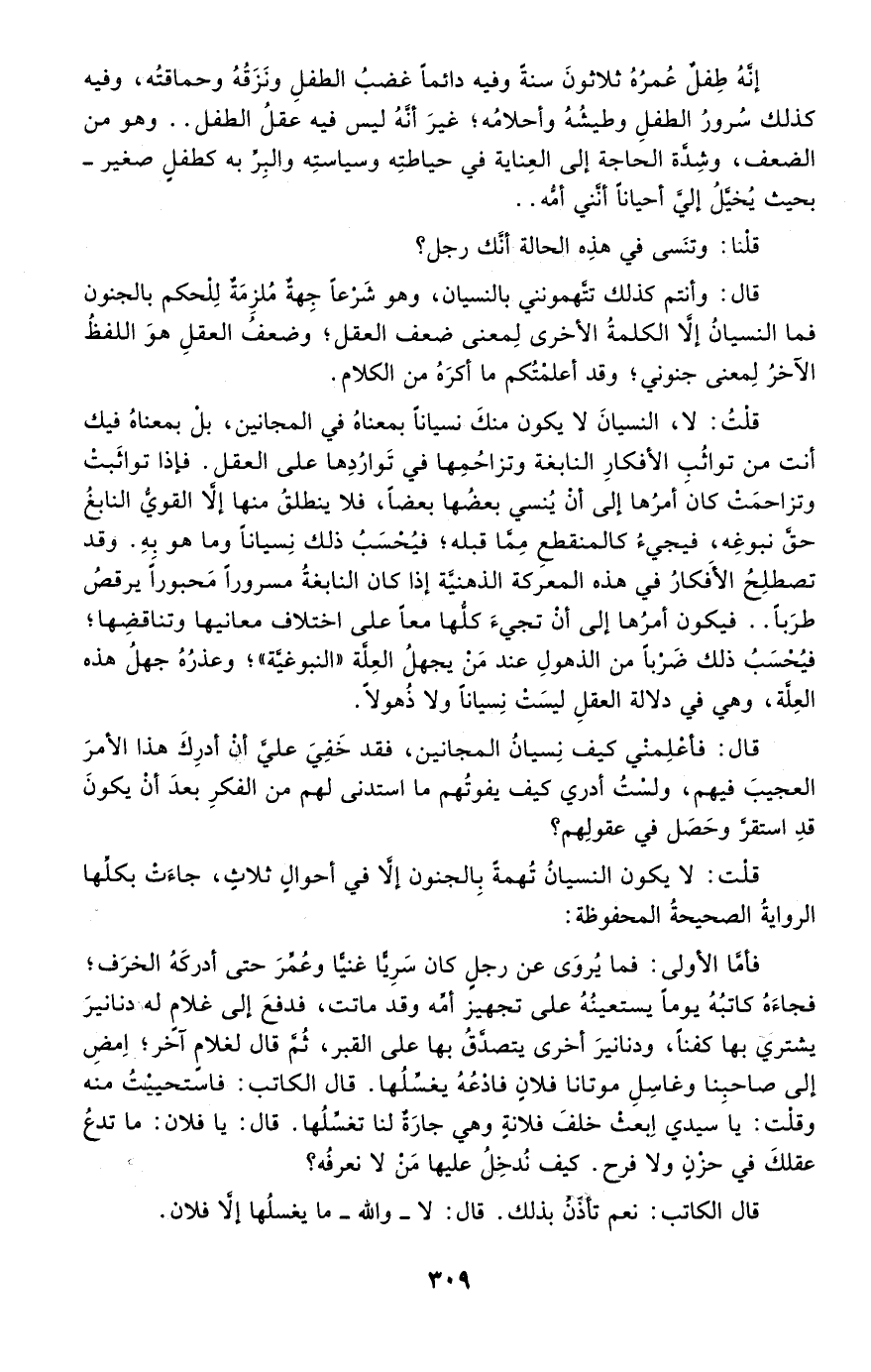 قال: فأعلمني كيف نسيان المجانين، فقد خفي على أن أدرك هذا الأمر العجيب فيهم، ولست أدري كيف يفوتهم ما استدنى لهم من الفكر بعد أن يكون قد استقر وحصل في عقولهم؟