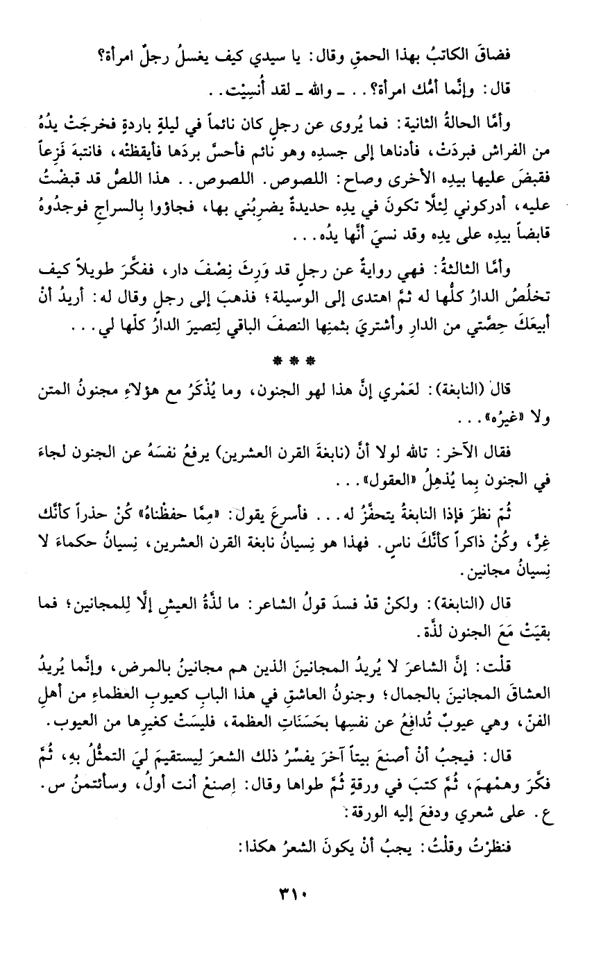 قلت: إن الشاعر لا يريد المجانين الذين هم مجانين بالمرض، وإنما يريد العشاق المجانين بالجمال؛ وجنون العاشق في هذا الباب كعيوب العظماء من أهل الفن، وهي عيوب تدافع عن نفسها بحسنات العظمة، فليست كغيرها من العيوب.