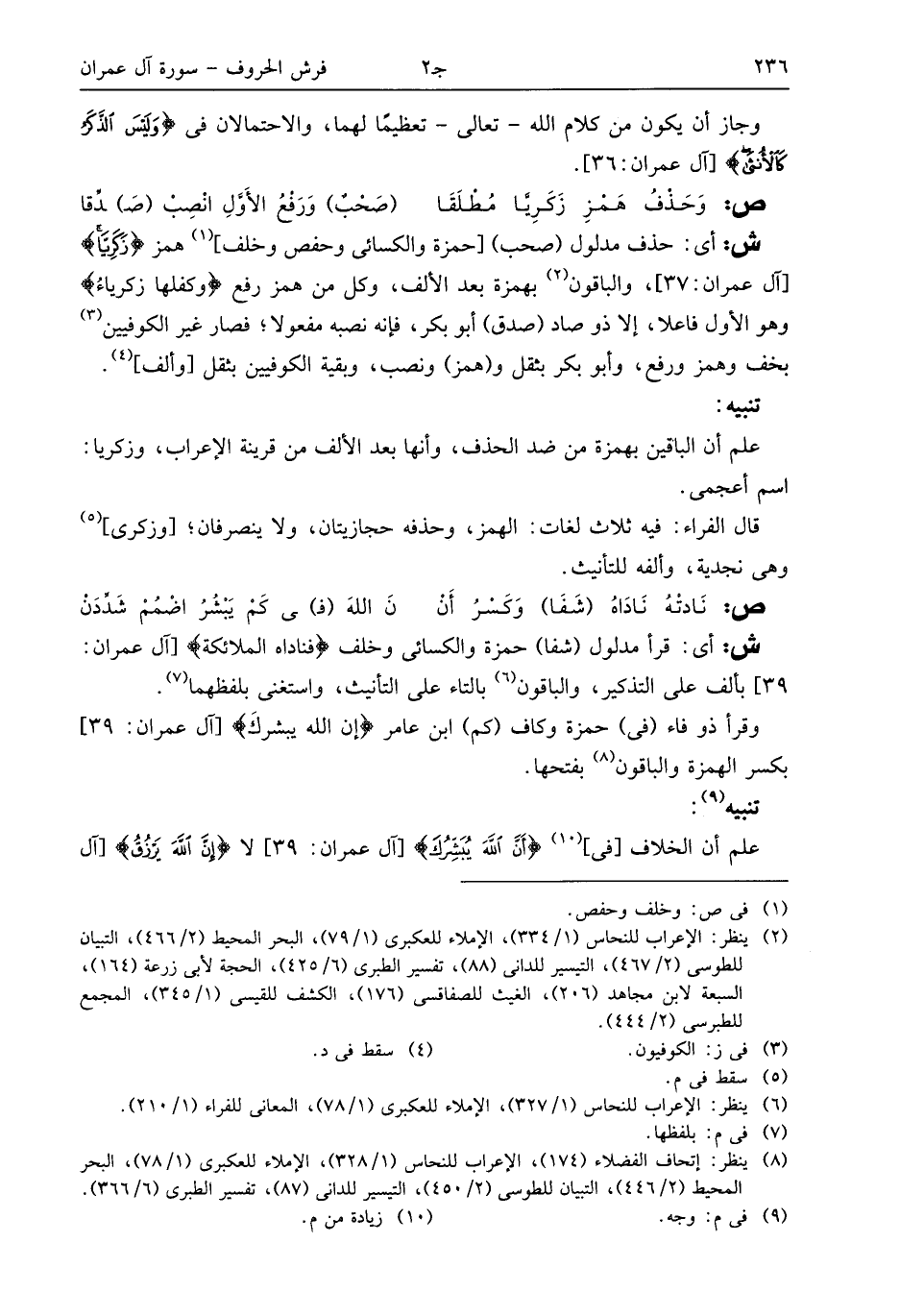(¬2) ينظر: الإعراب للنحاس (1/ 334)، الإملاء للعكبرى (1/ 79)، البحر المحيط (2/ 466)، التبيان للطوسى (2/ 467)، التيسير للدانى (88)، تفسير الطبرى (6/ 425)، الحجة لأبى زرعة (164)، السبعة لابن مجاهد (206)، الغيث للصفاقسى (176)، الكشف للقيسى (1/ 345)، المجمع للطبرسى (2/ 444).