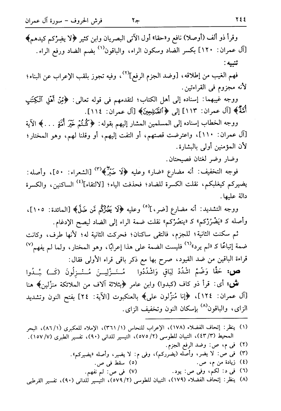 (¬8) ينظر: إتحاف الفضلاء (179)، التبيان للطوسى (2/ 579)، التيسير للدانى (90)، تفسير القرطبى