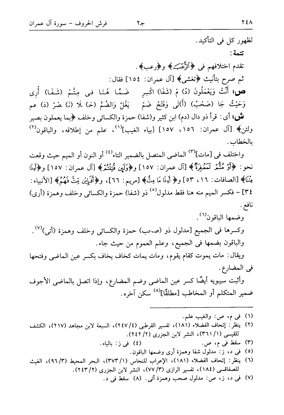 (¬6) ينظر: إتحاف الفضلاء (181)، الإعراب للنحاس (1/ 373)، البحر المحيط (3/ 96)، الغيث للصفاقسى (184)، تفسير الرازى (3/ 77)، النشر لابن الجزرى (2/ 243).