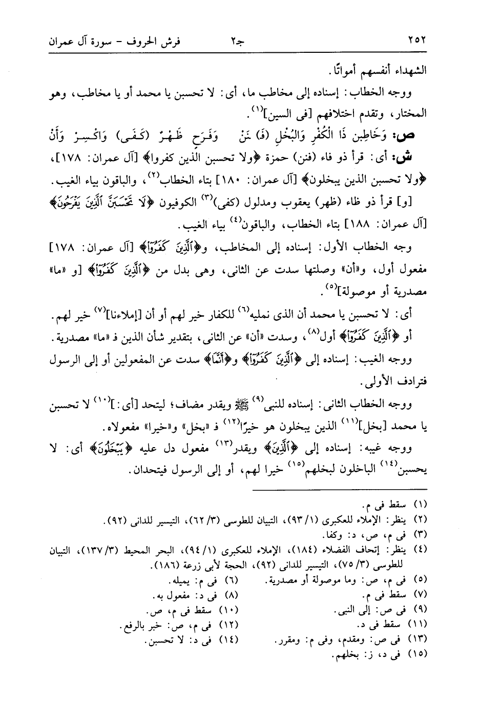 وجه الخطاب الأول: إسناده إلى المخاطب، والّذين كفروا [آل عمران: 178] مفعول أول، و «أن» وصلتها سدت عن الثانى، وهى بدل من الّذين كفروا [و «ما» مصدرية أو موصولة] (¬5).