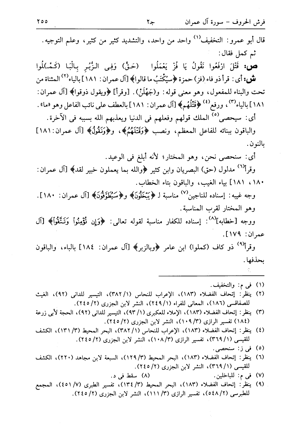 (¬9) ينظر: إتحاف الفضلاء (183)، البحر المحيط (3/ 134)، تفسير الطبرى (7/ 451)، المجمع للطبرسى (2/ 548)، تفسير الرازى (3/ 111)، النشر لابن الجزرى (2/ 245).