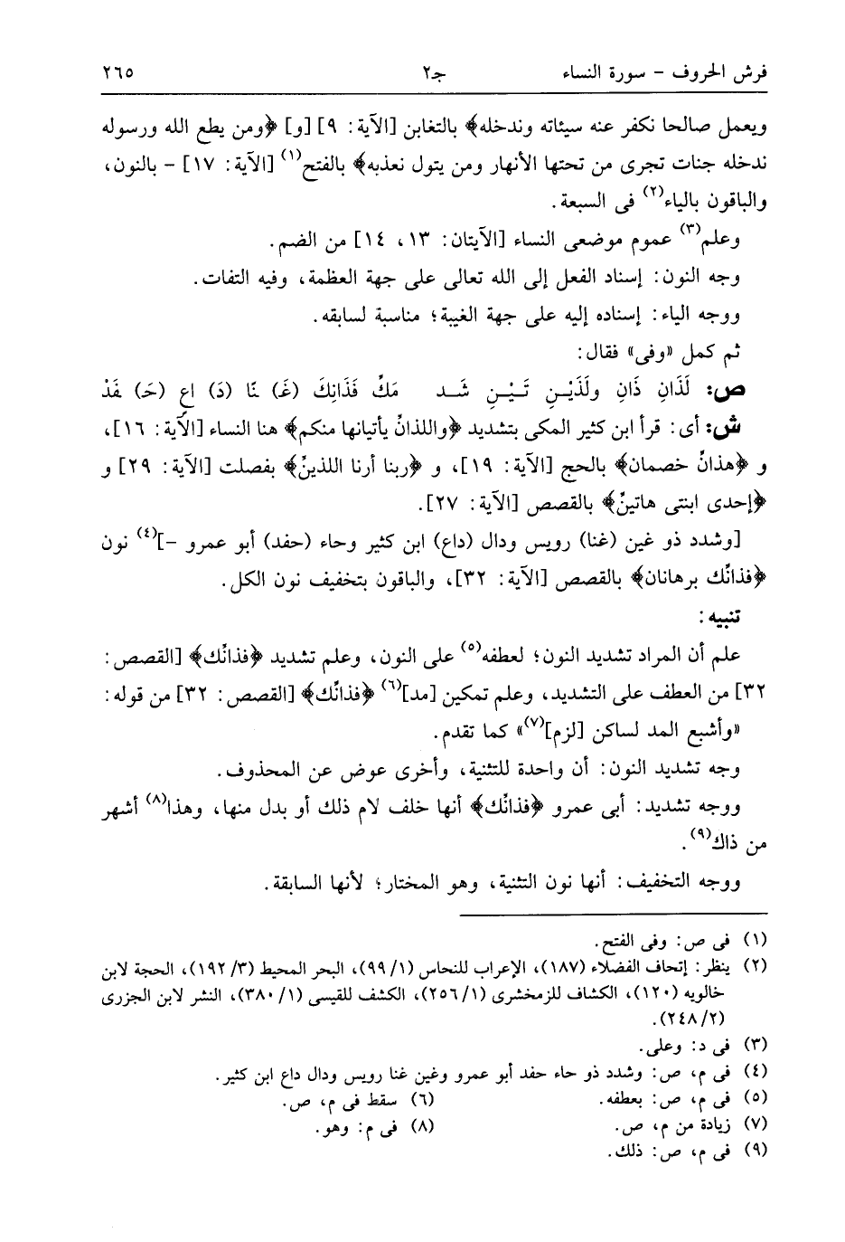 [وشدد ذو غين (غنا) رويس ودال (داع) ابن كثير وحاء (حفد) أبو عمرو-] (¬4) نون فذانّك برهانان بالقصص [الآية: 32]، والباقون بتخفيف نون الكل.