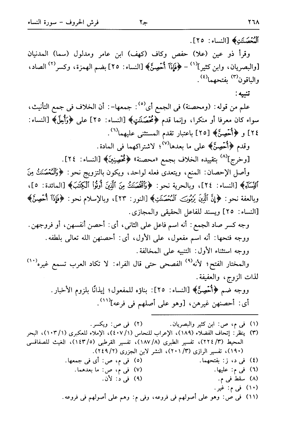 علم من قوله: (ومحصنة) فى الجمع أى (¬5): جمعها-: أن الخلاف فى جمع التأنيث، سواء كان معرفا أو منكرا، وإنما قدم محصنت [النساء: 25] على وأحلّ [النساء: