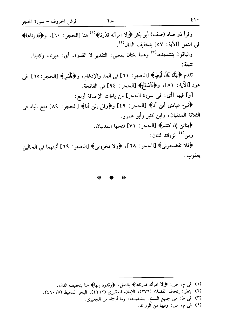 وقرأ ذو صاد (صف) أبو بكر إلا امرأته قدرنا (¬1) هنا [الحجر: 60]، وقدرناها فى النمل [الآية: 57] بتخفيف الدال (¬2).