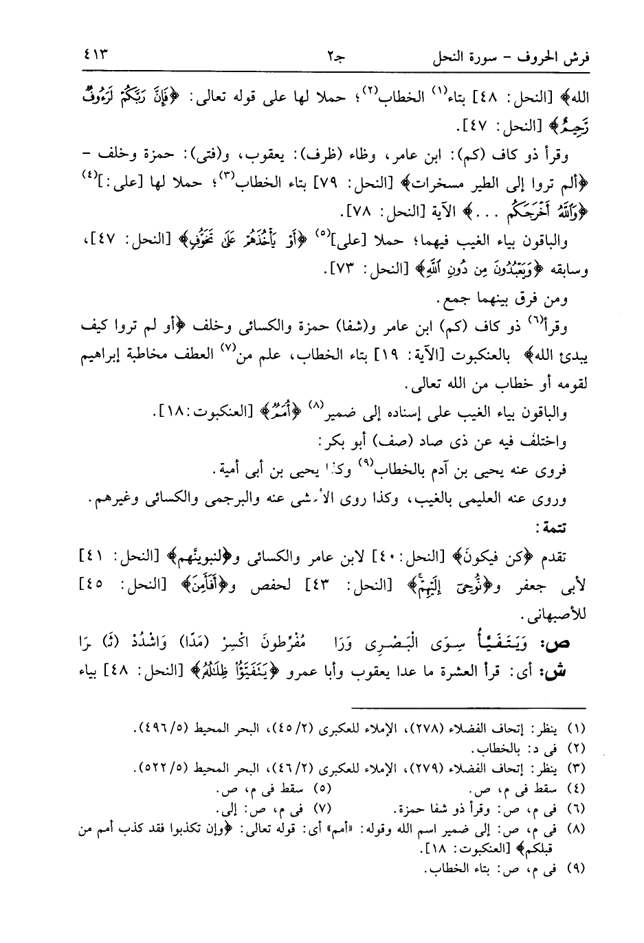 والباقون بياء الغيب فيهما؛ حملا [على] (¬5) أو يأخذهم على تخوّف [النحل: 47]، وسابقه ويعبدون من دون الله [النحل: 73].