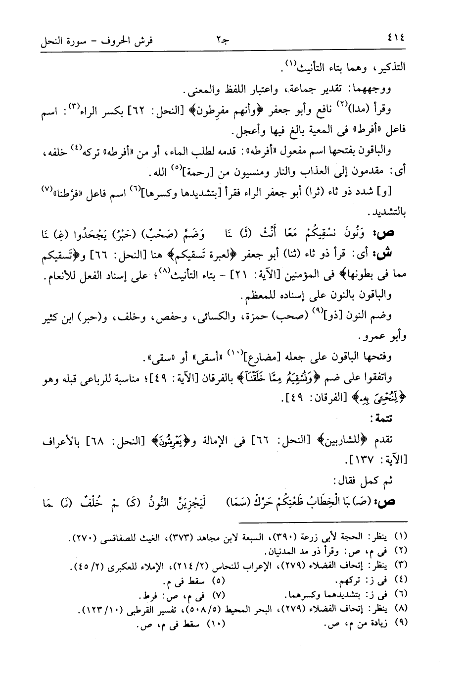 ش: أى: قرأ ذو ثاء (ثنا) أبو جعفر لعبرة تسقيكم هنا [النحل: 66] وتسقيكم مما فى بطونها فى المؤمنين [الآية: 21]- بتاء التأنيث (¬8)؛ على إسناد الفعل للأنعام.