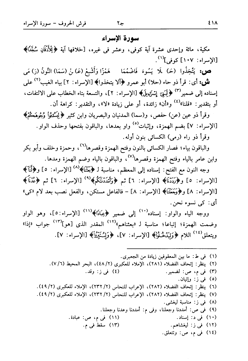 (¬2) ينظر: إتحاف الفضلاء (281)، الإملاء للعكبرى (2/ 48)، البحر المحيط (6/ 7).