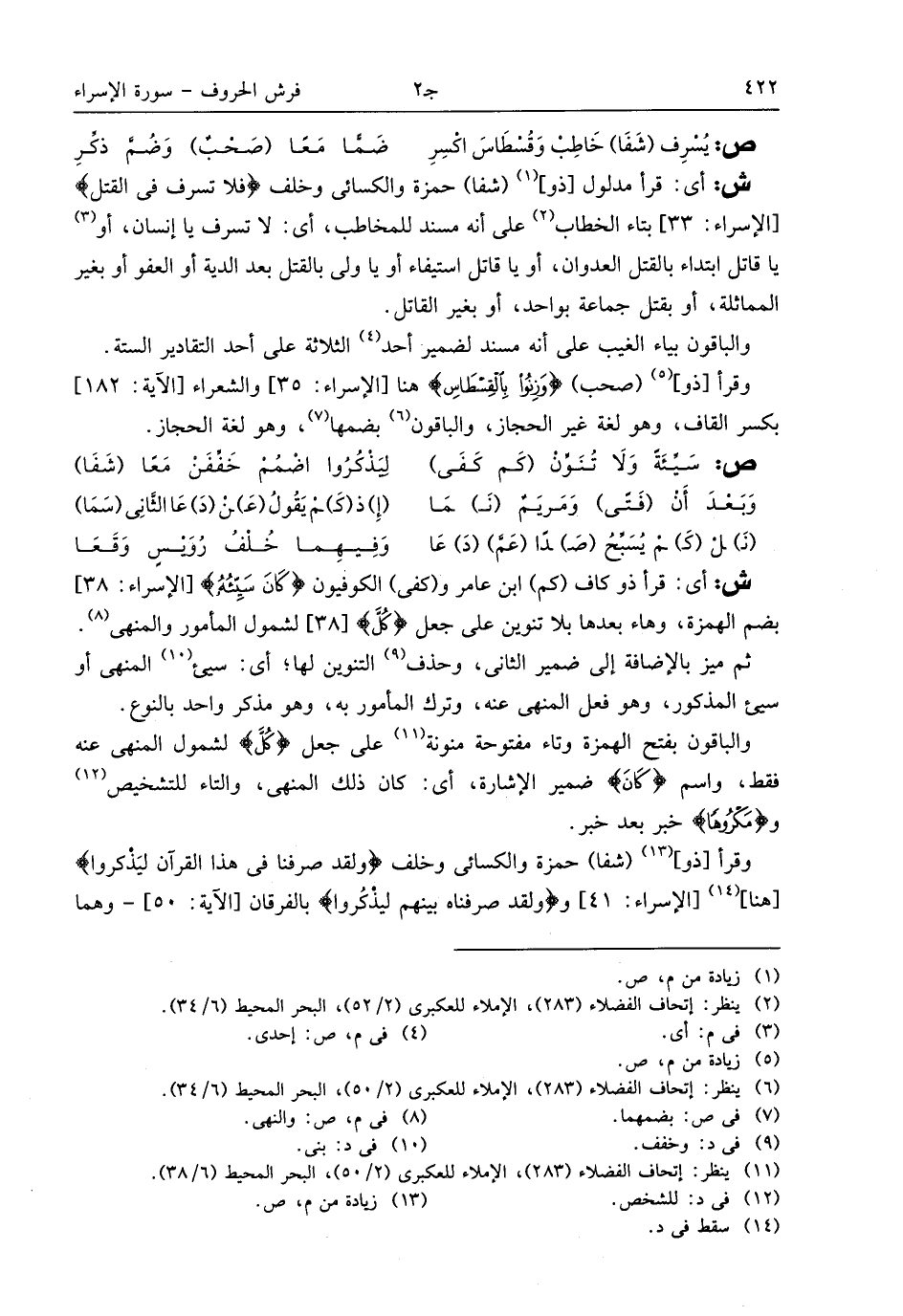 (¬2) ينظر: إتحاف الفضلاء (283)، الإملاء للعكبرى (2/ 52)، البحر المحيط (6/ 34).