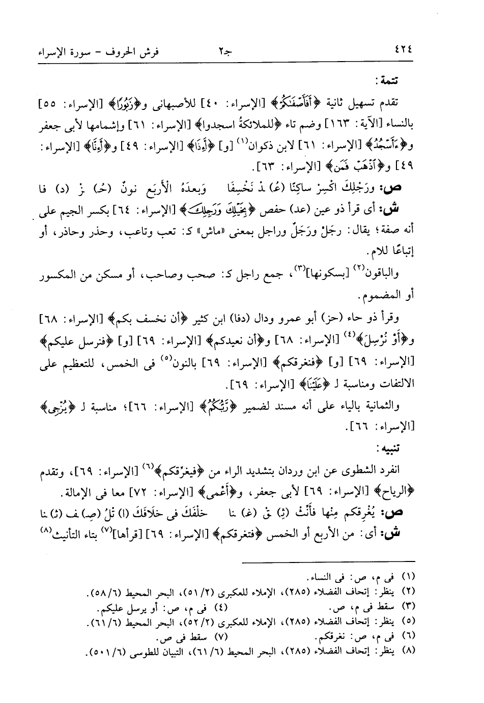 (¬8) ينظر: إتحاف الفضلاء (285)، البحر المحيط (6/ 61)، التبيان للطوسى (6/ 501).