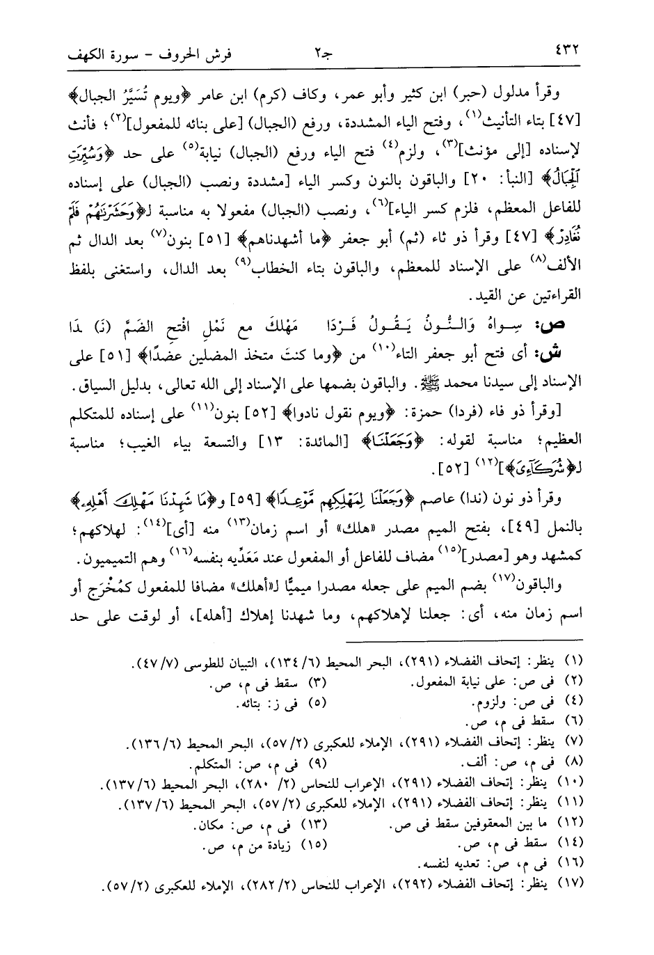 وقرأ مدلول (حبر) ابن كثير وأبو عمر، وكاف (كرم) ابن عامر ويوم تسيّر الجبال [47] بتاء التأنيث (¬1)، وفتح الياء المشددة، ورفع (الجبال) [على بنائه للمفعول] (¬2)؛ فأنث لإسناده [إلى مؤنث] (¬3)، ولزم (¬4) فتح الياء ورفع (الجبال) نيابة (¬5) على حد وسيّرت الجبال [النبأ: 20] والباقون بالنون وكسر الياء [مشددة ونصب (الجبال) على إسناده للفاعل المعظم، فلزم كسر الياء] (¬6)، ونصب (الجبال) مفعولا به مناسبة ل وحشرنهم فلم نغادر [47] وقرأ ذو ثاء (ثم) أبو جعفر ما أشهدناهم [51] بنون (¬7) بعد الدال ثم الألف (¬8) على الإسناد للمعظم، والباقون بتاء الخطاب (¬9) بعد الدال، واستغنى بلفظ القراءتين عن القيد.