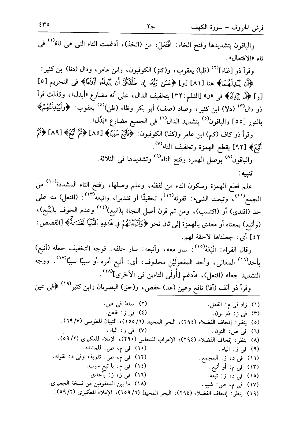 وقرأ ذو كاف (كم) ابن عامر و (كفا) الكوفيون: فأتبع سببا [85] ثمّ أتبع [89] ثمّ أتبع [92] بقطع الهمزة وتخفيف التاء (¬7).