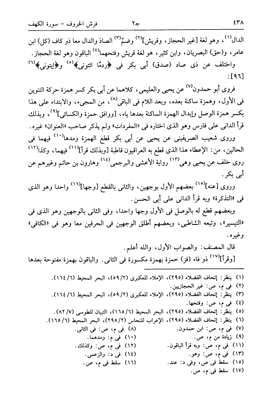 (¬6) ينظر: إتحاف الفضلاء (295)، الإعراب للنحاس (2/ 295)، البحر المحيط (6/ 165).