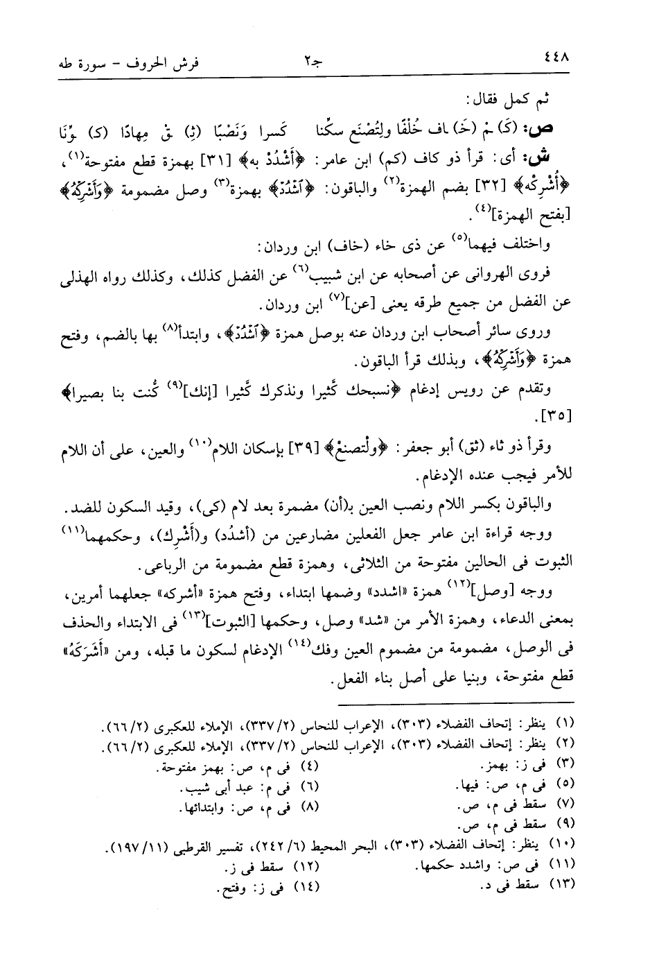 ووجه قراءة ابن عامر جعل الفعلين مضارعين من (اشدد) و (أشرك)، وحكمهما (¬11) الثبوت فى الحالين مفتوحة من الثلاثى، وهمزة قطع مضمومة من الرباعى.
