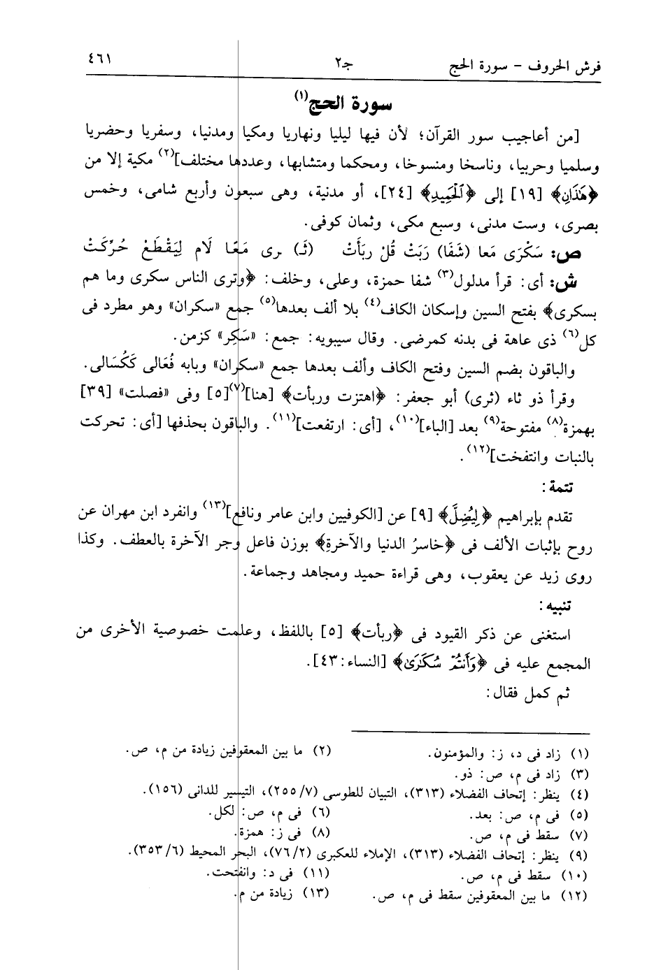 (¬4) ينظر: إتحاف الفضلاء (313)، التبيان للطوسى (7/ 255)، التيسير للدانى (156).