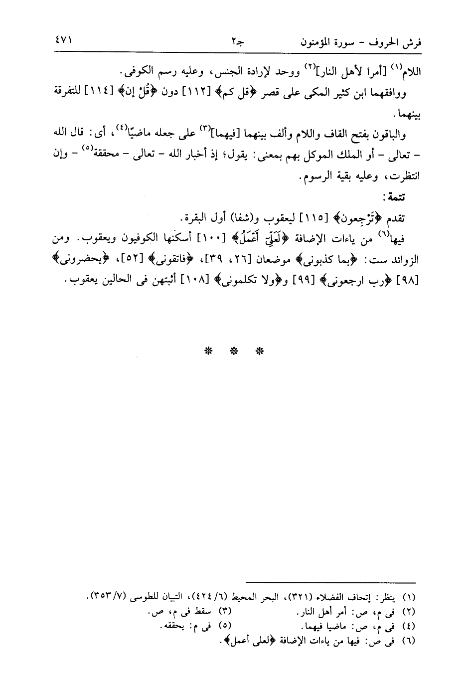 (¬1) ينظر: إتحاف الفضلاء (321)، البحر المحيط (6/ 424)، التبيان للطوسى (7/ 353).
