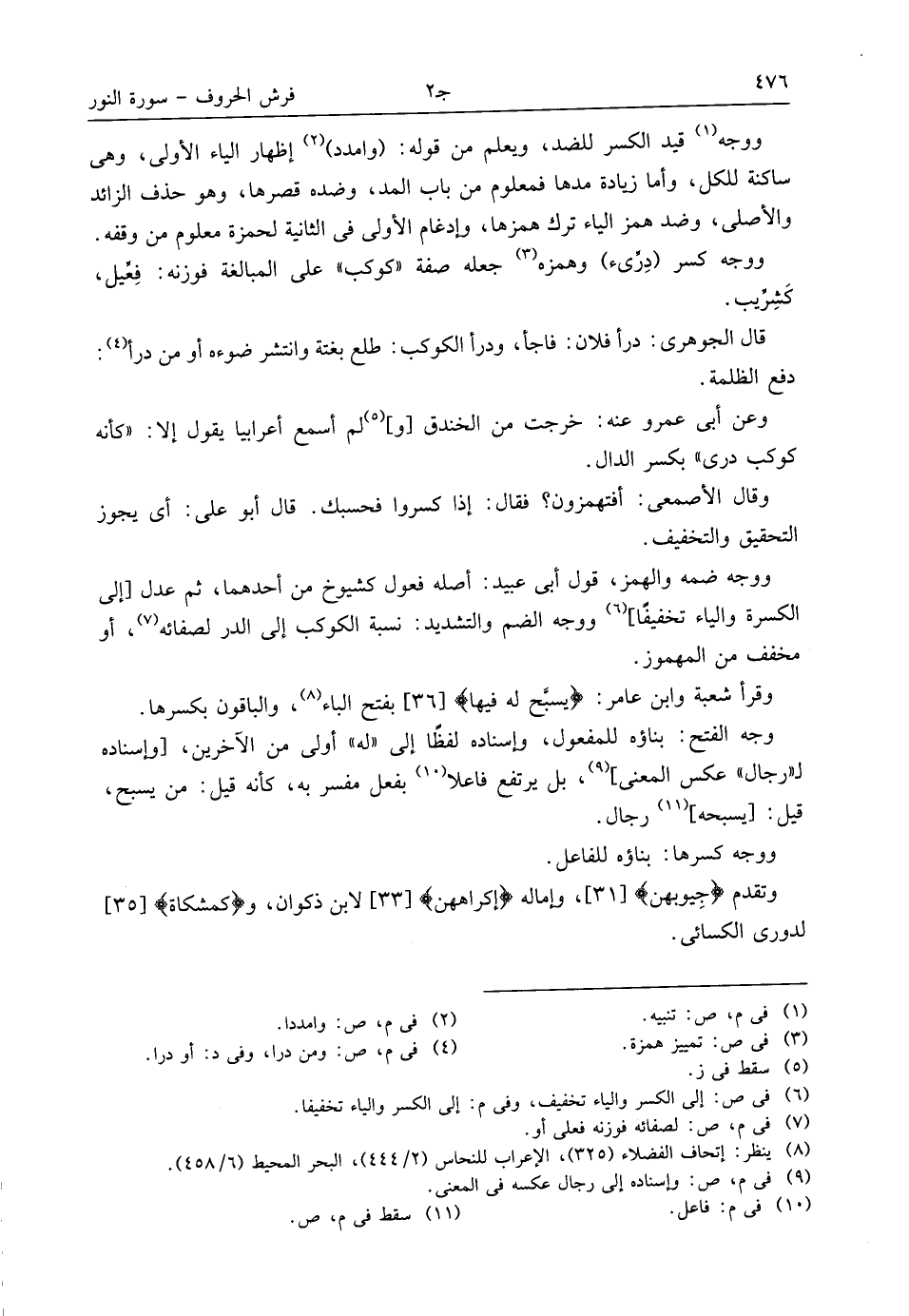 ووجه ضمه والهمز، قول أبى عبيد: أصله فعول كشيوخ من أحدهما، ثم عدل [إلى الكسرة والياء تخفيفا] (¬6) ووجه الضم والتشديد: نسبة الكوكب إلى الدر لصفائه (¬7)، أو مخفف من المهموز.