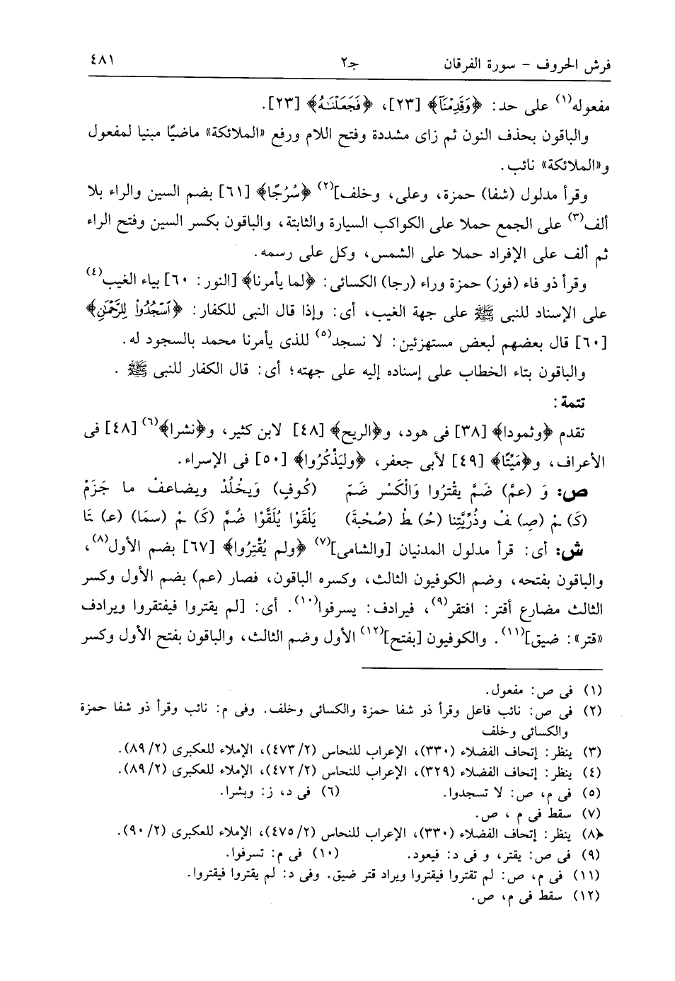 وقرأ مدلول (شفا) حمزة، وعلى، وخلف] (¬2) سرجا [61] بضم السين والراء بلا ألف (¬3) على الجمع حملا على الكواكب السيارة والثابتة، والباقون بكسر السين وفتح الراء ثم ألف على الإفراد حملا على الشمس، وكل على رسمه.