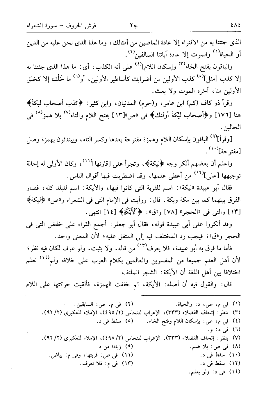 فقال أبو عبيدة «ليكة»: اسم للقرية التى كانوا فيها، والأيكة: اسم للبلد كله، فصار الفرق بينهما كما بين مكة وبكة. قال: ورأيت فى الإمام التى فى الشعراء و «ص» ليكة [13] والتى فى «الحجر» [78] و «ق»: الأيكة [14] انتهى.