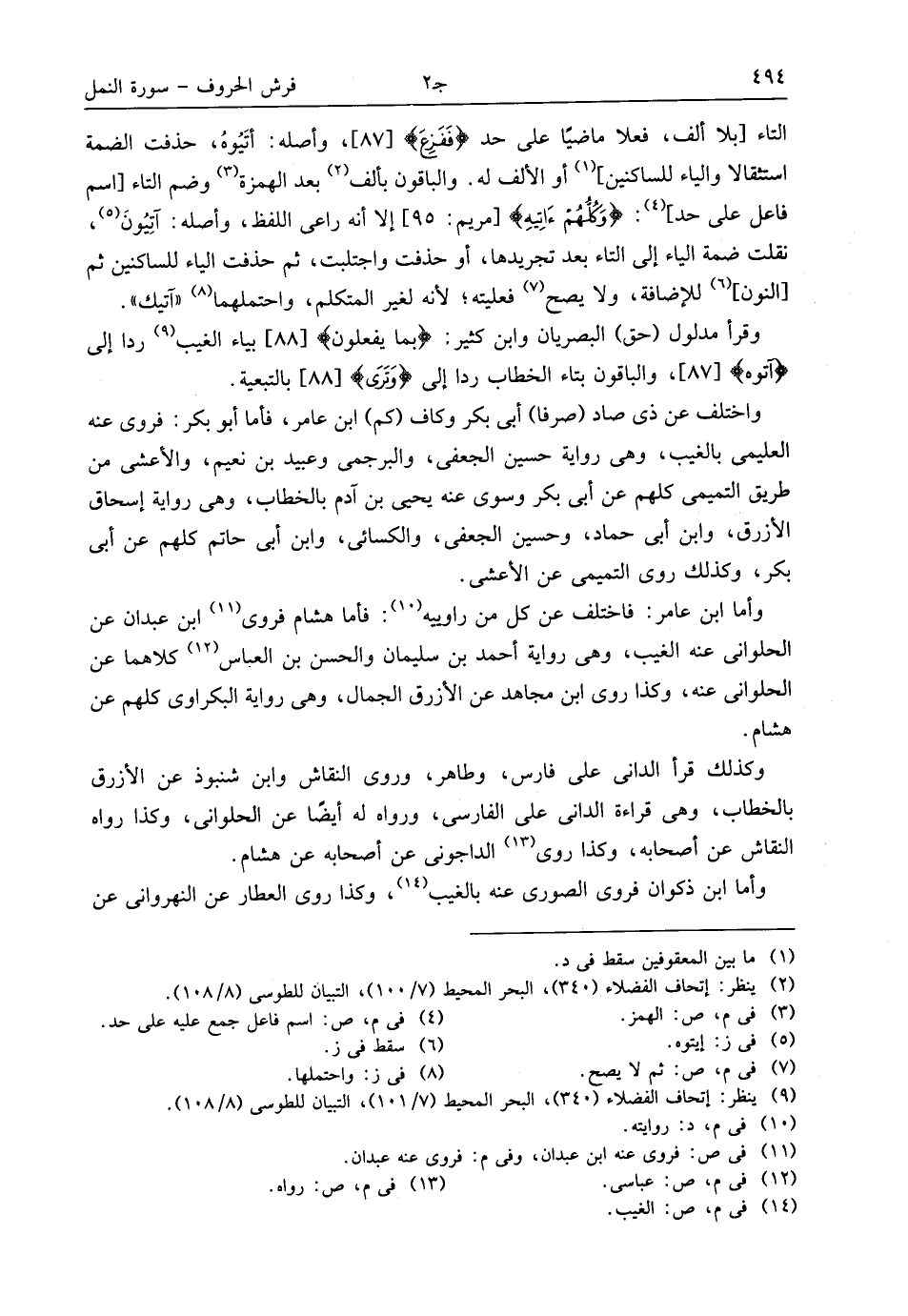 (¬9) ينظر: إتحاف الفضلاء (340)، البحر المحيط (7/ 101)، التبيان للطوسى (8/ 108).