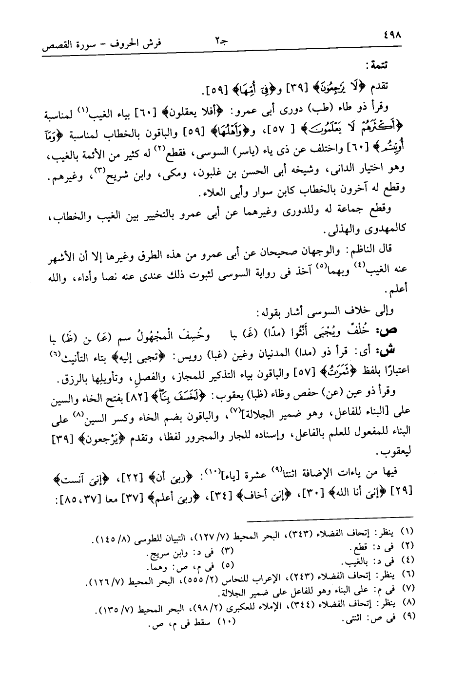 (¬1) ينظر: إتحاف الفضلاء (343)، البحر المحيط (7/ 127)، التبيان للطوسى (8/ 145).