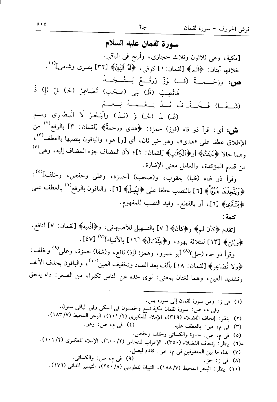 ش: أى: قرأ ذو فاء (فوز) حمزة: هدى ورحمة [لقمان: 3] بالرفع (¬2) من الإطلاق عطفا على «هدى»، وهو خبر ثان، أى [و] هو، والباقون بنصبها بالعطف (¬3)، وهما حالا ءايت أو الكتب [لقمان: 2]؛ لأن المضاف جزء المضاف إليه، وهى (¬4) من قسم المؤكدة، والعامل معنى الإشارة.