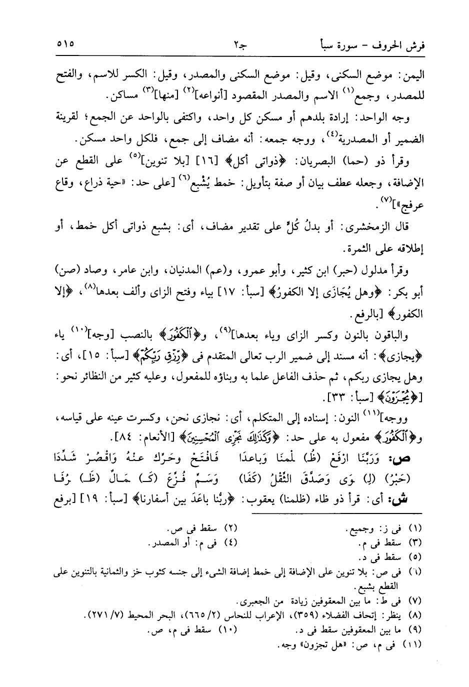 وقرأ ذو (حما) البصريان: ذواتى أكل [16] [بلا تنوين] (¬5) على القطع عن الإضافة، وجعله عطف بيان أو صفة بتأويل: خمط يشبع (¬6) [على حد: «حية ذراع، وقاع عرفج»] (¬7).