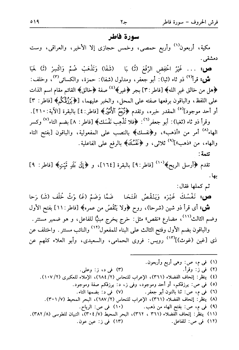 هل من خالق غير الله [فاطر: 3] بجر غير (¬4) صفة خالق القائم مقام اسم الذات على اللفظ، والباقون برفعها صفته على المحل، والخبر عليهما، [يرزقكم [فاطر: 3] أو أحد موجود] (¬5) المقدر خبره، وتقدم ترجع الأمور [فاطر: 4] بالبقرة [الآية: 210].
