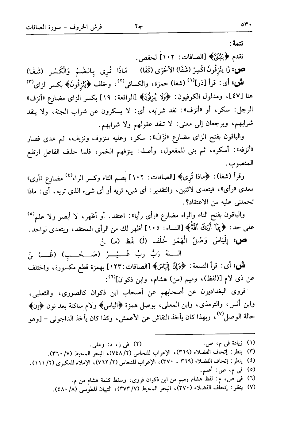 (¬7) ينظر: إتحاف الفضلاء (370)، البحر المحيط (7/ 373)، التبيان للطوسى (8/ 480).