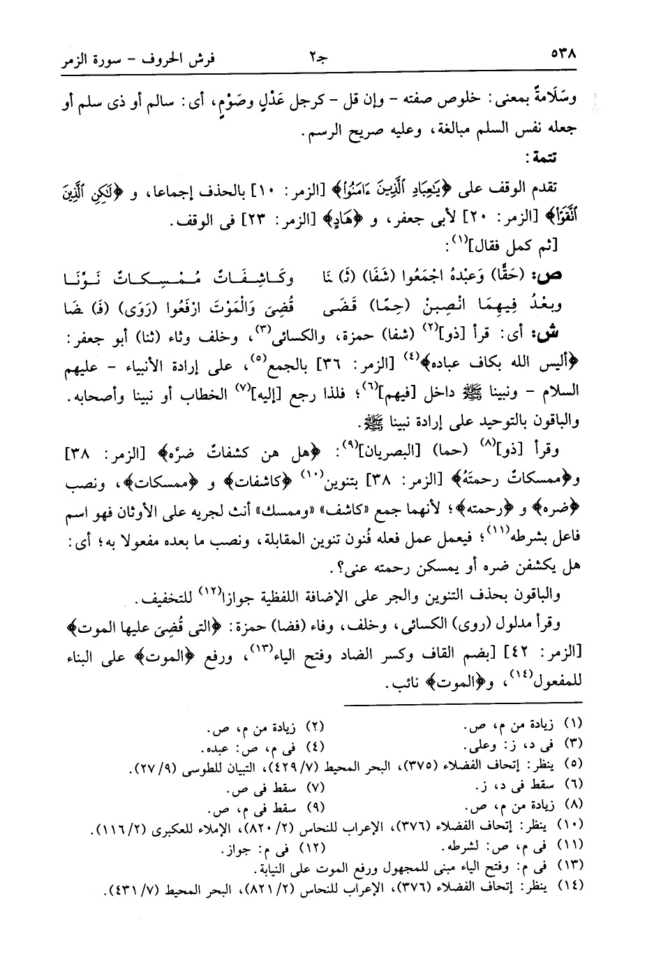 (¬5) ينظر: إتحاف الفضلاء (375)، البحر المحيط (7/ 429)، التبيان للطوسى (9/ 27).