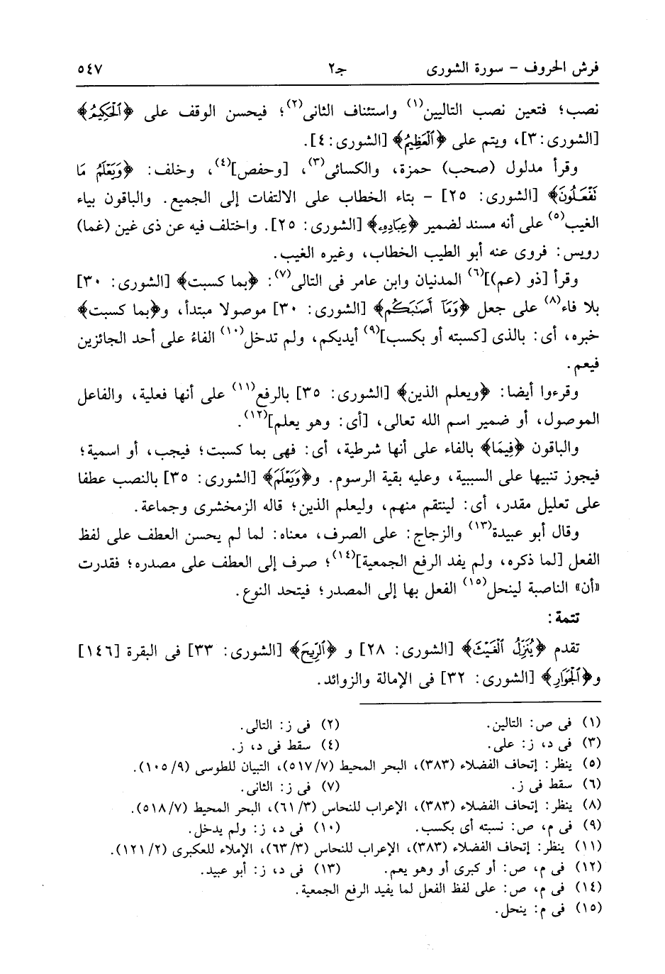 والباقون فيما بالفاء على أنها شرطية، أى: فهى بما كسبت؛ فيجب، أو اسمية؛ فيجوز تنبيها على السببية، وعليه بقية الرسوم. وو يعلم [الشورى: 35] بالنصب عطفا على تعليل مقدر، أى: لينتقم منهم، وليعلم الذين؛ قاله الزمخشرى وجماعة.