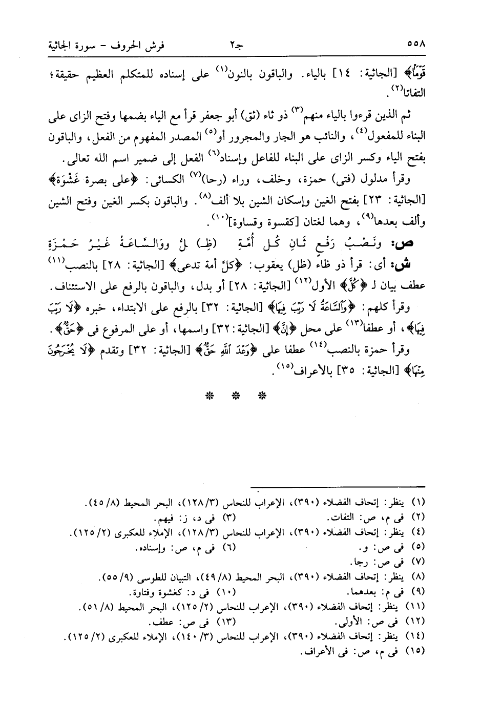 (¬11) ينظر: إتحاف الفضلاء (390)، الإعراب للنحاس (2/ 125)، البحر المحيط (8/ 51).