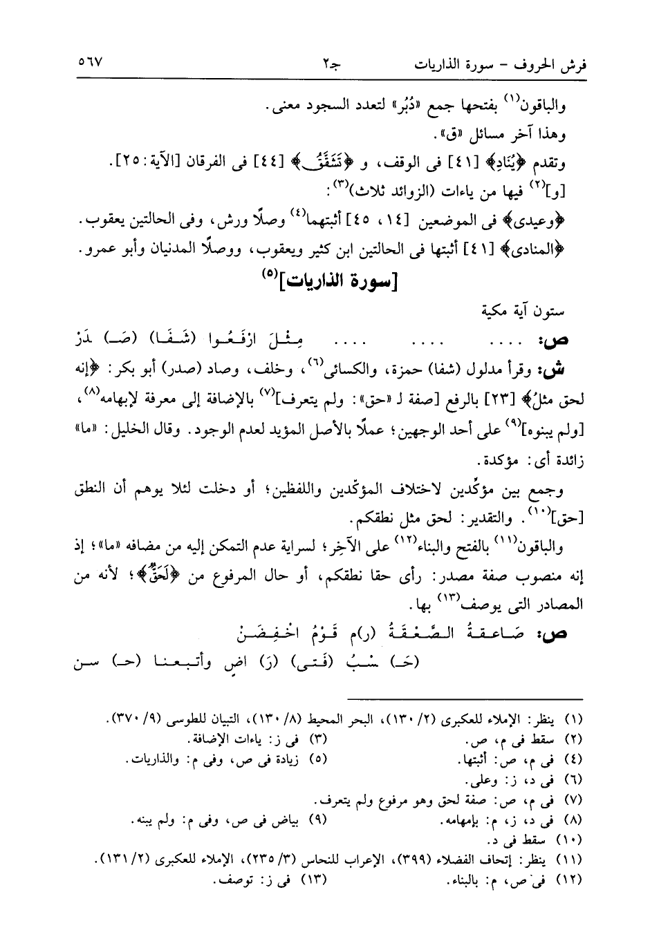 والباقون (¬11) بالفتح والبناء (¬12) على الآخر؛ لسراية عدم التمكن إليه من مضافه «ما»؛ إذ إنه منصوب صفة مصدر: رأى حقا نطقكم، أو حال المرفوع من لحقّ؛ لأنه من المصادر التى يوصف (¬13) بها.