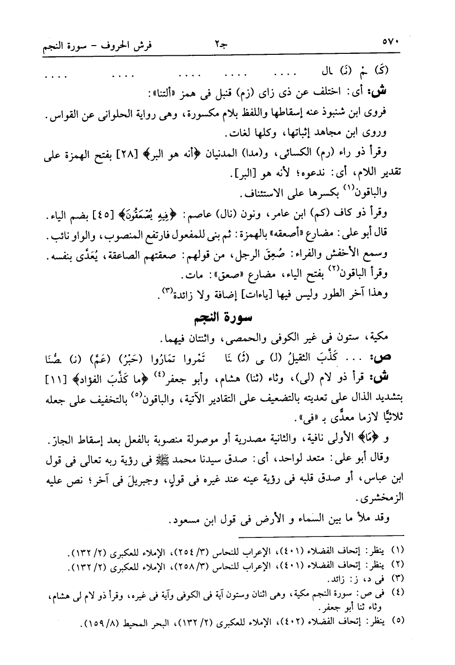 (¬5) ينظر: إتحاف الفضلاء (402)، الإملاء للعكبرى (2/ 132)، البحر المحيط (8/ 159).
