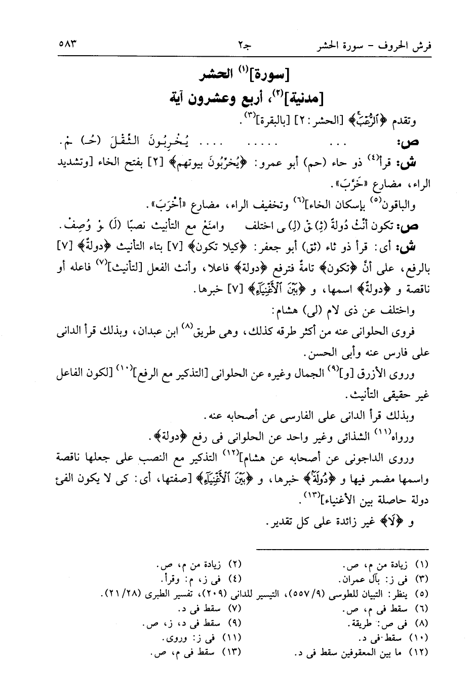 (¬5) ينظر: التبيان للطوسى (9/ 557)، التيسير للدانى (209)، تفسير الطبرى (28/ 21).