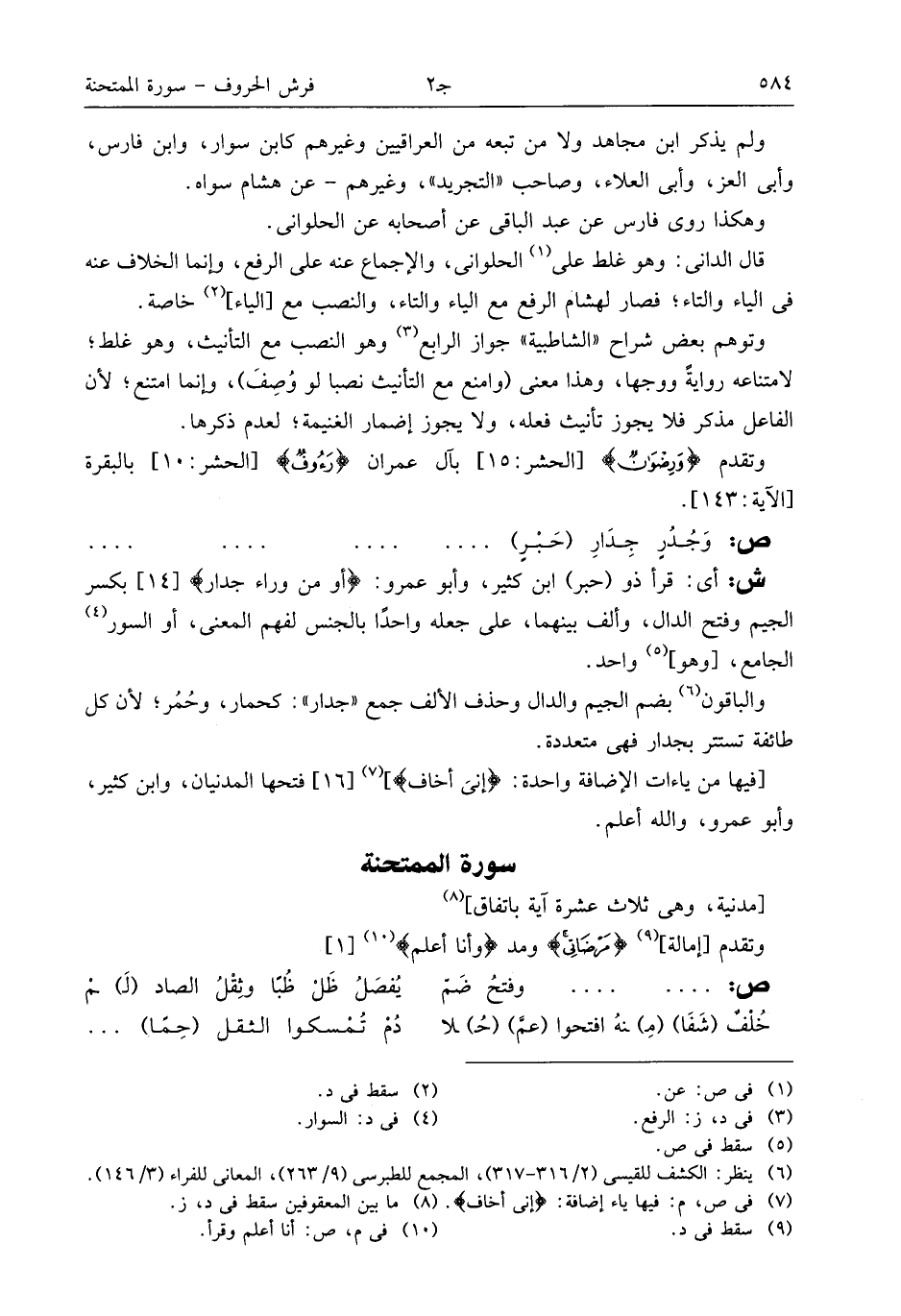 (¬6) ينظر: الكشف للقيسى (2/ 316 - 317)، المجمع للطبرسى (9/ 263)، المعانى للفراء (3/ 146).
