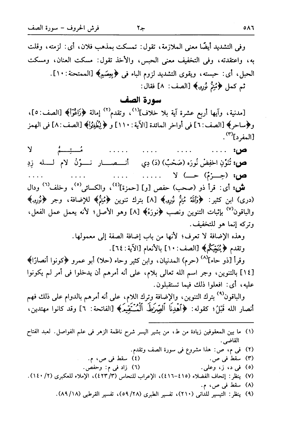 ش: أى: قرأ ذو (صحب) حفص [و] [حمزة] (¬4)، والكسائى (¬5)، وخلف (¬6) ودال (درى) ابن كثير: والله متمّ نوره [8] بترك تنوين متمّ للإضافة، وجر نوره والباقون (¬7) بإثبات التنوين ونصب نوره [8] وهو الأصل؛ لأنه يعمل عمل الفعل، وتركه إنما هو للتخفيف.