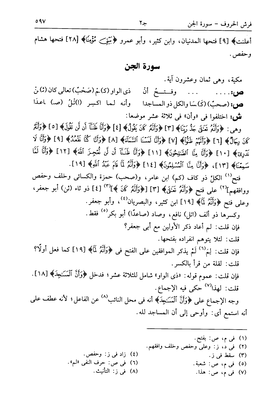 فتح (¬1) الكلّ ذو كاف (كم) ابن عامر، و (صحب) حمزة والكسائى وخلف وحفص ووافقهم] (¬2) على فتح وأنّه تعلى [3] وأنّه كان] (¬3) [4] ذو ثاء (ثن) أبو جعفر، وعلى فتح وأنّه لمّا [19] ابن كثير، والبصريان (¬4)، وأبو جعفر.