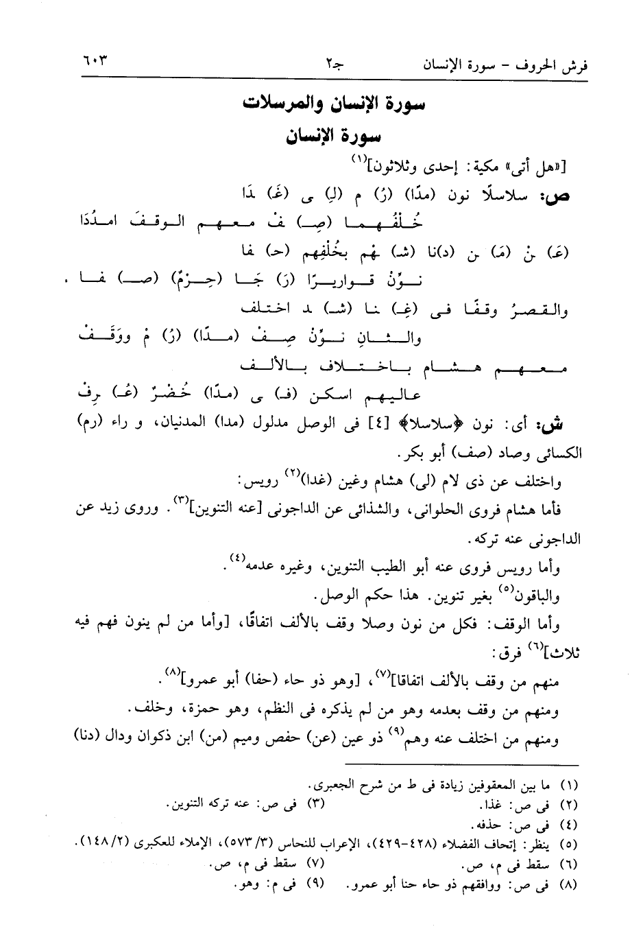 ش: أى: نون سلاسلا [4] فى الوصل مدلول (مدا) المدنيان، وراء (رم) الكسائى وصاد (صف) أبو بكر.
