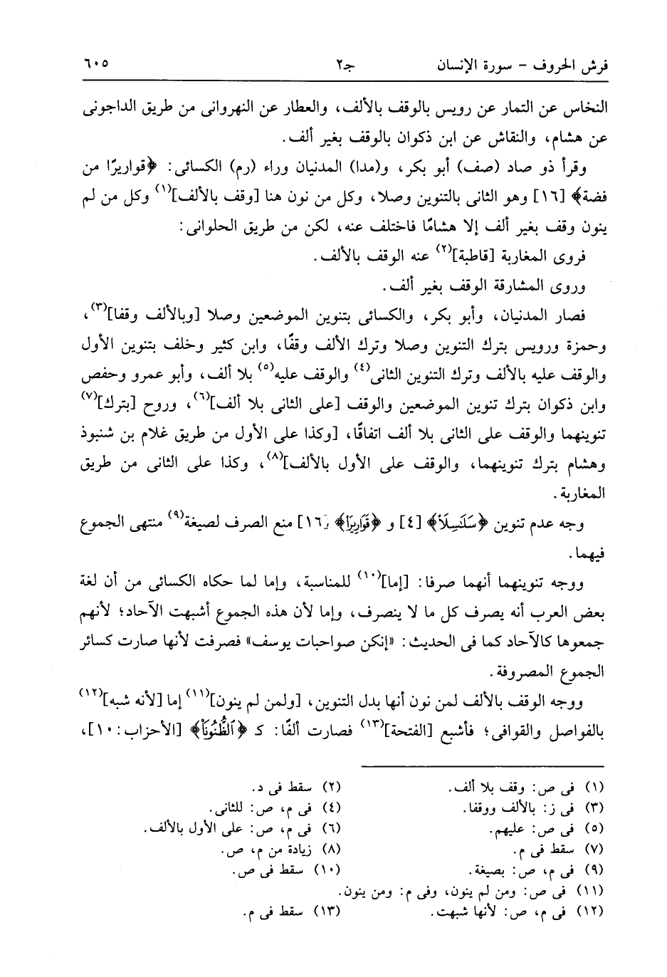 وقرأ ذو صاد (صف) أبو بكر، و (مدا) المدنيان وراء (رم) الكسائى: قواريرا من فضة [16] وهو الثانى بالتنوين وصلا، وكل من نون هنا [وقف بالألف] (¬1) وكل من لم ينون وقف بغير ألف إلا هشاما فاختلف عنه، لكن من طريق الحلوانى: