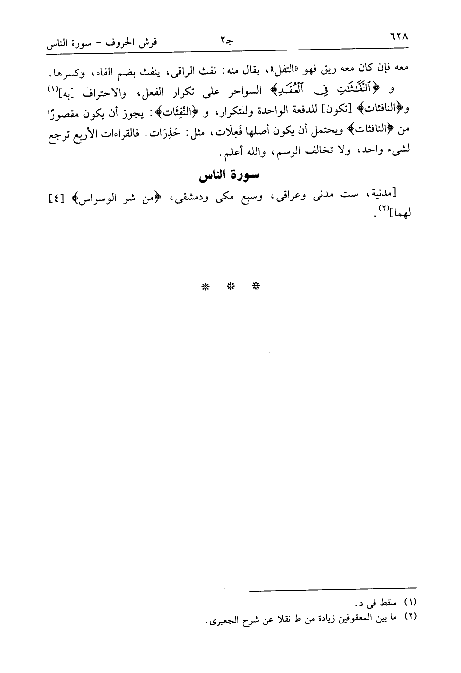 والنّفّثت فى العقد السواحر على تكرار الفعل، والاحتراف [به] (¬1) والنافثات [تكون] للدفعة الواحدة وللتكرار، والنّفثات: يجوز أن يكون مقصورا من النافثات ويحتمل أن يكون أصلها فعلات، مثل: حذرات. فالقراءات الأربع ترجع لشىء واحد، ولا تخالف الرسم، والله أعلم.