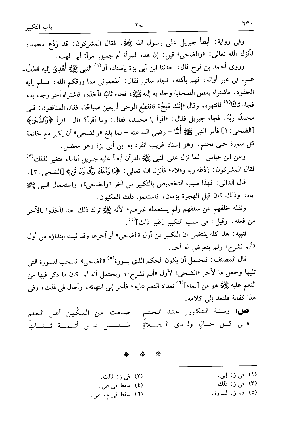 قال الدانى: فهذا سبب التخصيص بالتكبير من آخر «والضحى»، واستعمال النبى صلّى الله عليه وسلّم إياه، وذلك كان قبل الهجرة بزمان، فاستعمل ذلك المكيون.