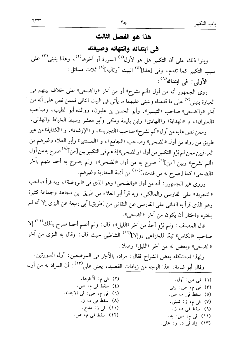 وممن نص عليه من أول «ألم نشرح» صاحب «التجريد»، و «الإرشاد»، و «الكفاية» من غير طريق من رواه من أول «الضحى» وصاحب «الجامع»، و «المستنير» وأبو العلاء وغيرهم من العراقيين ممن لم يرو التكبير من أول «والضحى» إذ هم فى التكبير بين [من] (¬8) صرح به من أول «ألم نشرح» وبين [من] (¬9) صرح به من أول «الضحى»، ولم يصرح به أحد منهم بآخر «الضحى» كما [صرح به من قدمناه] (¬10) من أئمة المغاربة وغيرهم.