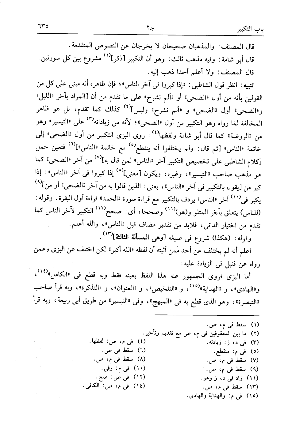 تنبيه: انظر قول الشاطبى: «إذا كبروا فى آخر الناس»؛ فإن ظاهره أنه مبنى على كل من القولين بأنه من أول «الضحى» أو «ألم نشرح» على ما تقدم من أن [المراد بآخر «الليل» و «الضحى» أول «الضحى» و «ألم نشرح» وليس] (¬2) كذلك كما تقدم، بل هو ظاهر المخالفة لما رواه وهو التكبير من أول «الضحى»؛ لأنه من زياداته (¬3) على «التيسير» وهو من «الروضة» كما قال أبو شامة ولفظها (¬4): روى البزى التكبير من أول «الضحى» إلى خاتمة «الناس» [ثم قال: ولم يختلفوا أنه ينقطع (¬5) مع خاتمة «الناس»] (¬6) فتعين حمل [كلام الشاطبى على تخصيص التكبير آخر «الناس» لمن قال به] (¬7) من آخر «الضحى» كما هو مذهب صاحب «التيسير»، وغيره، ويكون [معنى] (¬8) إذا كبروا فى آخر «الناس»: إذا كبر من [يقول بالتكبير فى آخر «الناس»، يعنى: الذين قالوا به من آخر «الضحى» أو من] (¬9) يكبر فى (¬10) آخر «الناس» يردف بالتكبير مع قراءة سورة «الحمد» قراءة أول البقرة. وقوله: