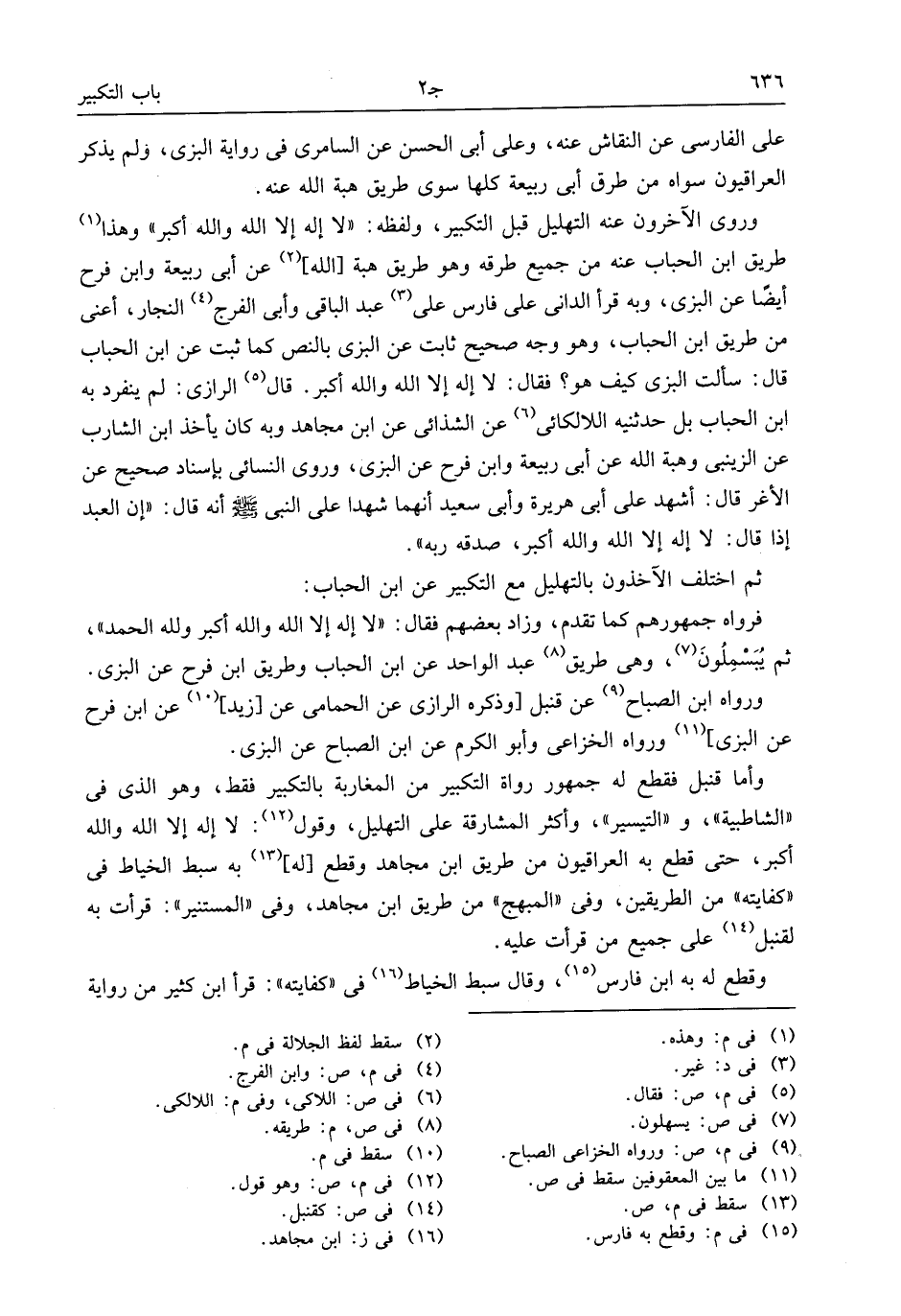 وروى الآخرون عنه التهليل قبل التكبير، ولفظه: «لا إله إلا الله والله أكبر» وهذا (¬1) طريق ابن الحباب عنه من جميع طرقه وهو طريق هبة [الله] (¬2) عن أبى ربيعة وابن فرح أيضا عن البزى، وبه قرأ الدانى على فارس على (¬3) عبد الباقى وأبى الفرج (¬4) النجار، أعنى من طريق ابن الحباب، وهو وجه صحيح ثابت عن البزى بالنص كما ثبت عن ابن الحباب قال: سألت البزى كيف هو؟ فقال: لا إله إلا الله والله أكبر. قال (¬5) الرازى: لم ينفرد به ابن الحباب بل حدثنيه اللالكائى (¬6) عن الشذائى عن ابن مجاهد وبه كان يأخذ ابن الشارب عن الزينبى وهبة الله عن أبى ربيعة وابن فرح عن البزى، وروى النسائى بإسناد صحيح عن الأغر قال: أشهد على أبى هريرة وأبى سعيد أنهما شهدا على النبى صلّى الله عليه وسلّم أنه قال: «إن العبد إذا قال: لا إله إلا الله والله أكبر، صدقه ربه».