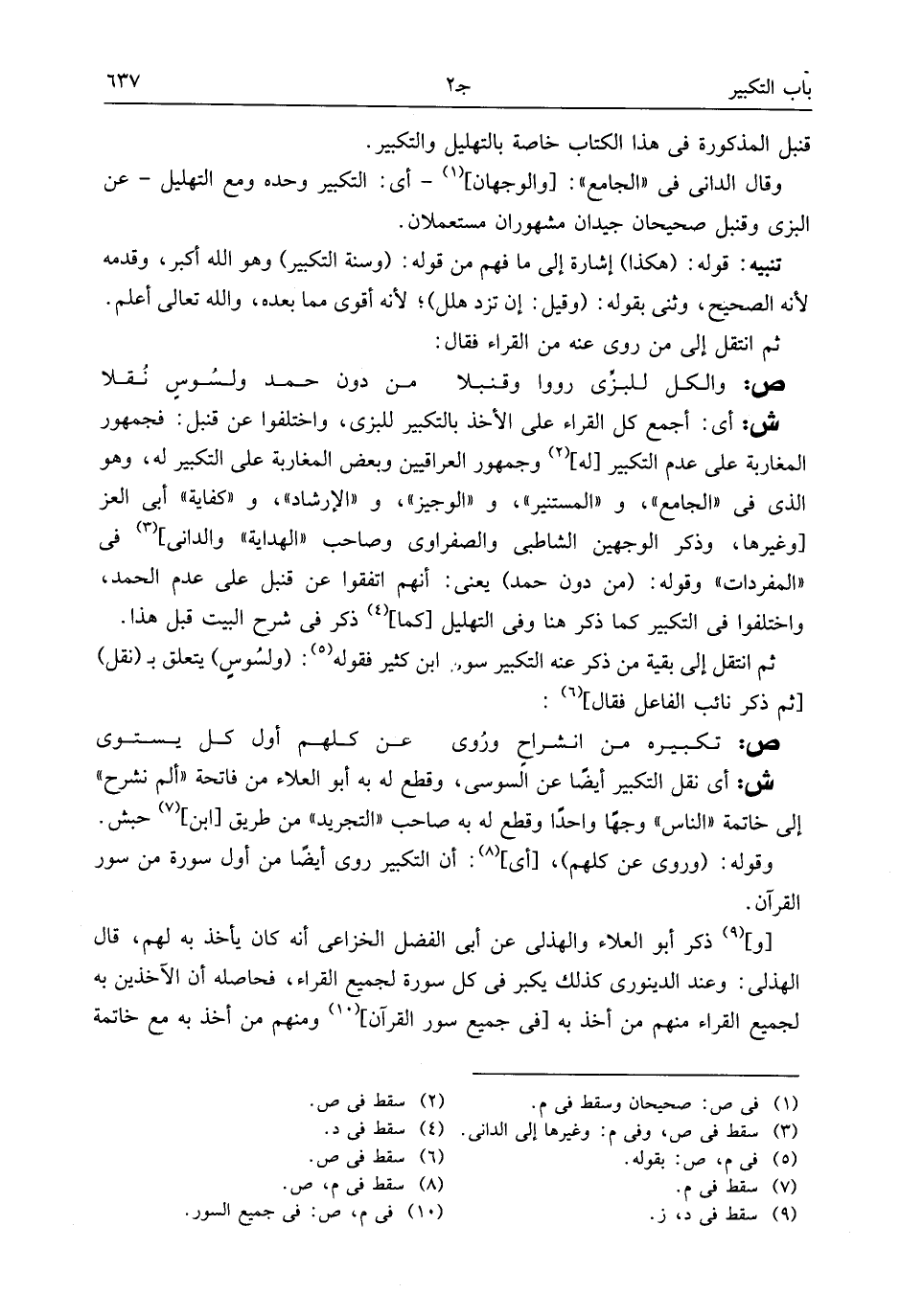 ش: أى نقل التكبير أيضا عن السوسى، وقطع له به أبو العلاء من فاتحة «ألم نشرح» إلى خاتمة «الناس» وجها واحدا وقطع له به صاحب «التجريد» من طريق [ابن] (¬7) حبش.