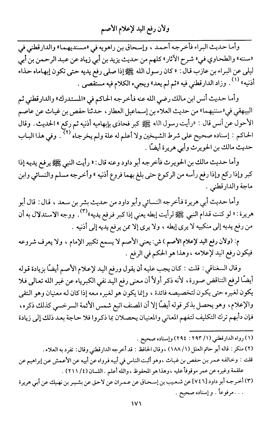 وأما حديث مالك بن الحويرث فأخرجه أبو داود عنه قال: «رأيت النبي - صَلَّى اللَّهُ عَلَيْهِ وَسَلَّمَ - يرفع يديه إذا كبر وإذا ركع وإذا رفع رأسه من الركوع حتى بلغ بهما فروع أذنيه» وأخرجه مسلم والنسائي وابن ماجه والدارقطني.