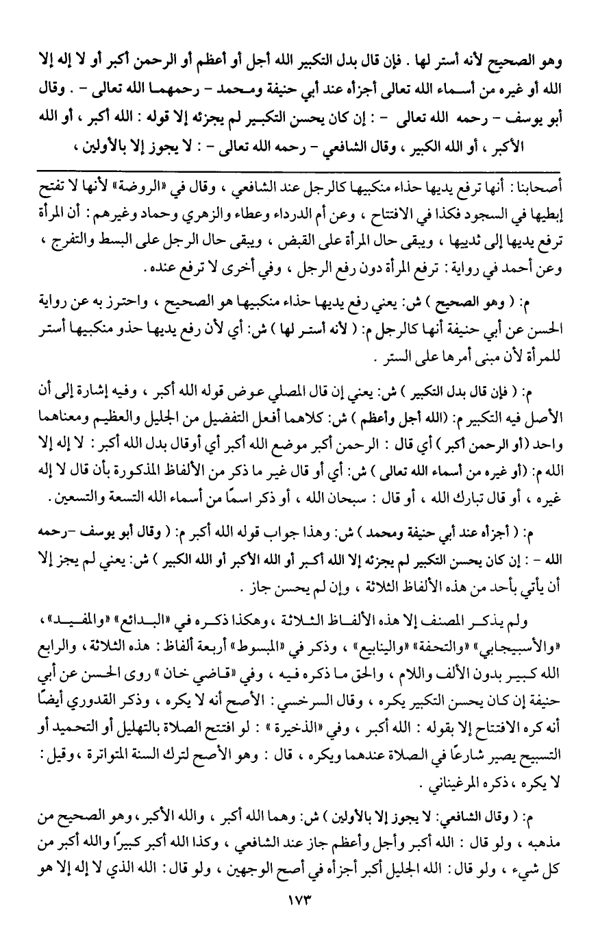 فإن قال بدل التكبير: الله أجل أو عظم، أو الرحمن أكبر أو لا إله إلا الله، أو غيره من أسماء الله تعالى، أجزأه عند أبي حنيفة ومحمد رحمهما الله تعالى وقال أبو يوسف - رَحِمَهُ اللَّهُ تَعَالَى -: إن كان يحسن التكبير لم يجزئه إلا قوله: الله أكبر، أو الله الأكبر، أو الله الكبير، وقال الشافعي - رَحِمَهُ اللَّهُ تَعَالَى -: لا يجوز إلا بالأولين.