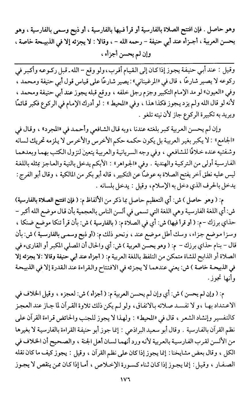 م: (أو قرأ فيها) ش: أي في الصلاة م: (بالفارسية) ش: بأن قرأ تنكا موضع ضنكا، وسزا موضع جزاء، وسك أطل موضع عند، ونحو ذلك م: (أو ذبح وسمى بالفارسية) ش: بأن قال بنام حذاي برزك م: (وهو يحسن العربية) ش: أي والحال أن المصلي المكبر أو القارئ في الصلاة أو الذابح للشاة متمكن من التلفظ باللغة العربية م: (أجزأه عند أبي حنيفة، وقالا: لا يجزئه إلا في الذبيحة خاصة) ش: يعني عندهما لا يجزئه في الافتتاح والقراءة عند القدرة إلا في الذبيحة وأنها تجوز.